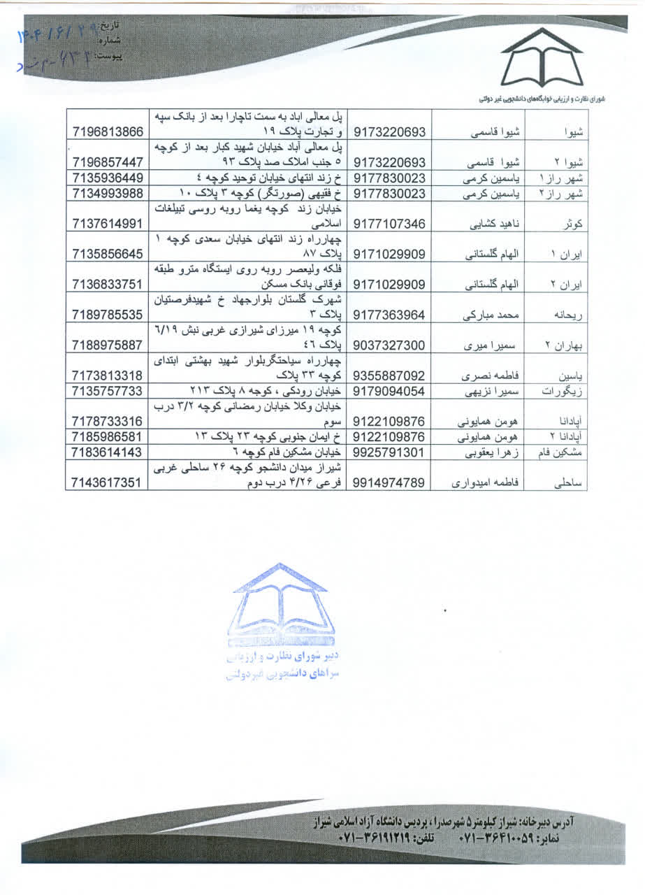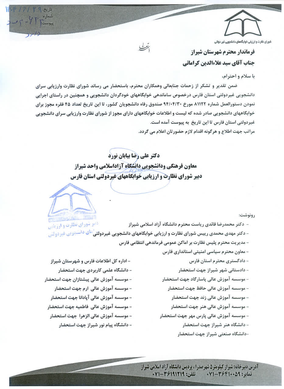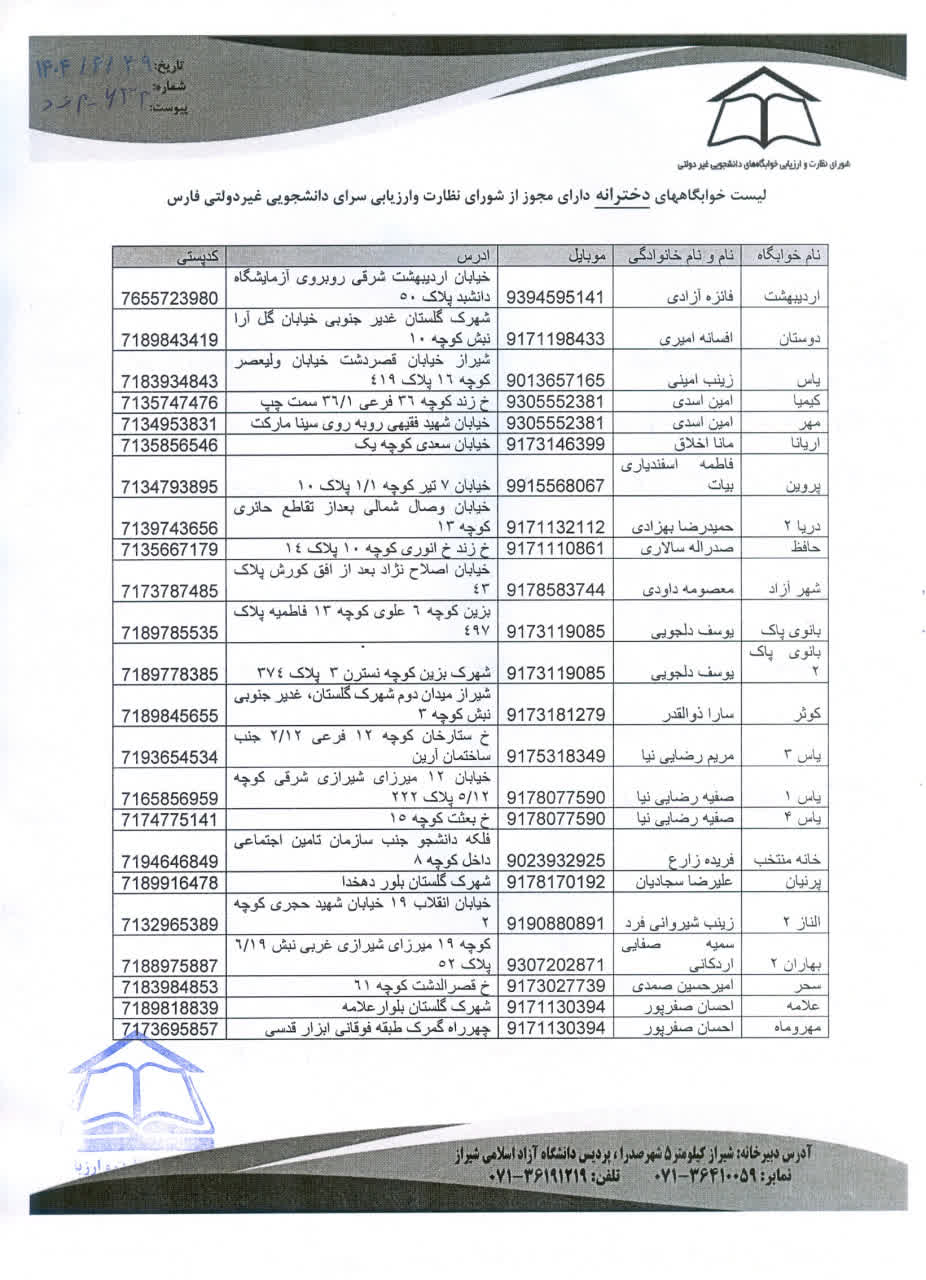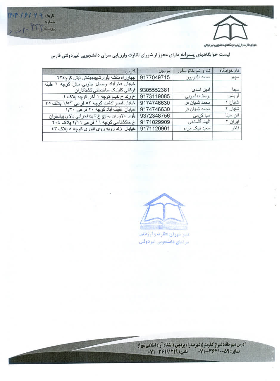 بدینوسیله به اطلاع دانشجویان غیربومی میرساند، لیست خوابگاه های تأیید شده از سوی شورای نظارت و ارزیابی خوابگاه های غیردولتی استان فارس بر روی سایت دانشگاه قرارداده شده است.