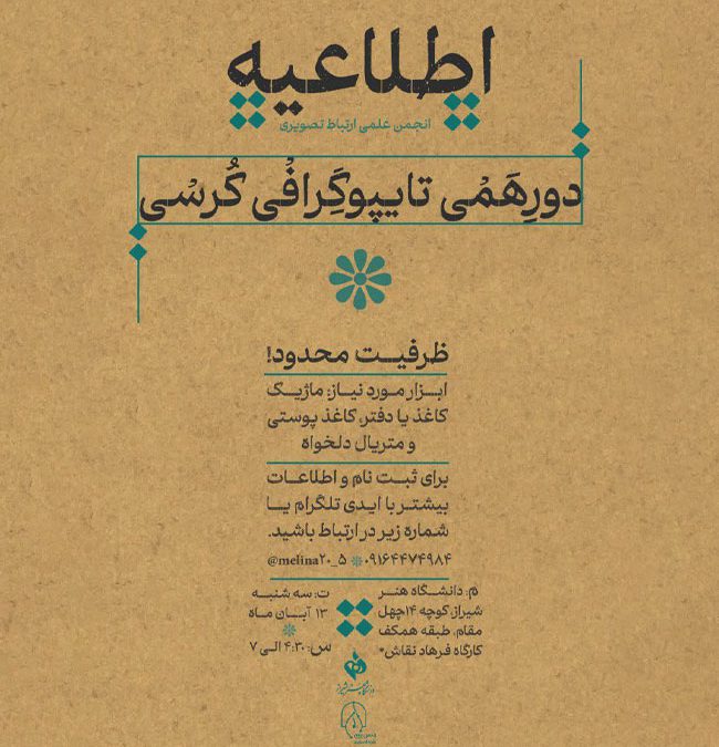 انجمن علمی ارتباط تصویری دانشگاه هنر شیراز در نظر دارد روز سهشنبه ۱۳ آبانماه ۱۴۰۴ از ساعت ۴:۳۰ تا ۷ عصر، دورهمی تایپوگرافی " کُرسی" را در دانشگاه هنر شیراز، کوچه ۱۴ چهل مقام، طبقه همکف، کارگاه فرهاد نقاش برگزار نماید.