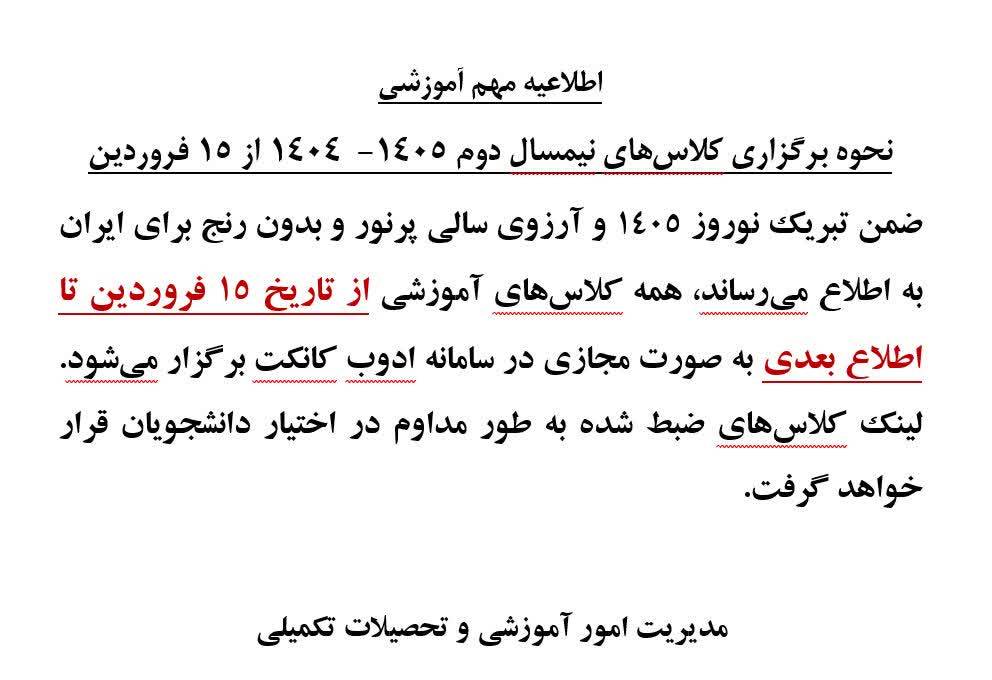 اطلاعیه مهم آموزشی در خصوص نحوه برگزاری کلاسهای نیمسال دوم 1405- 1404 از 15 فروردین